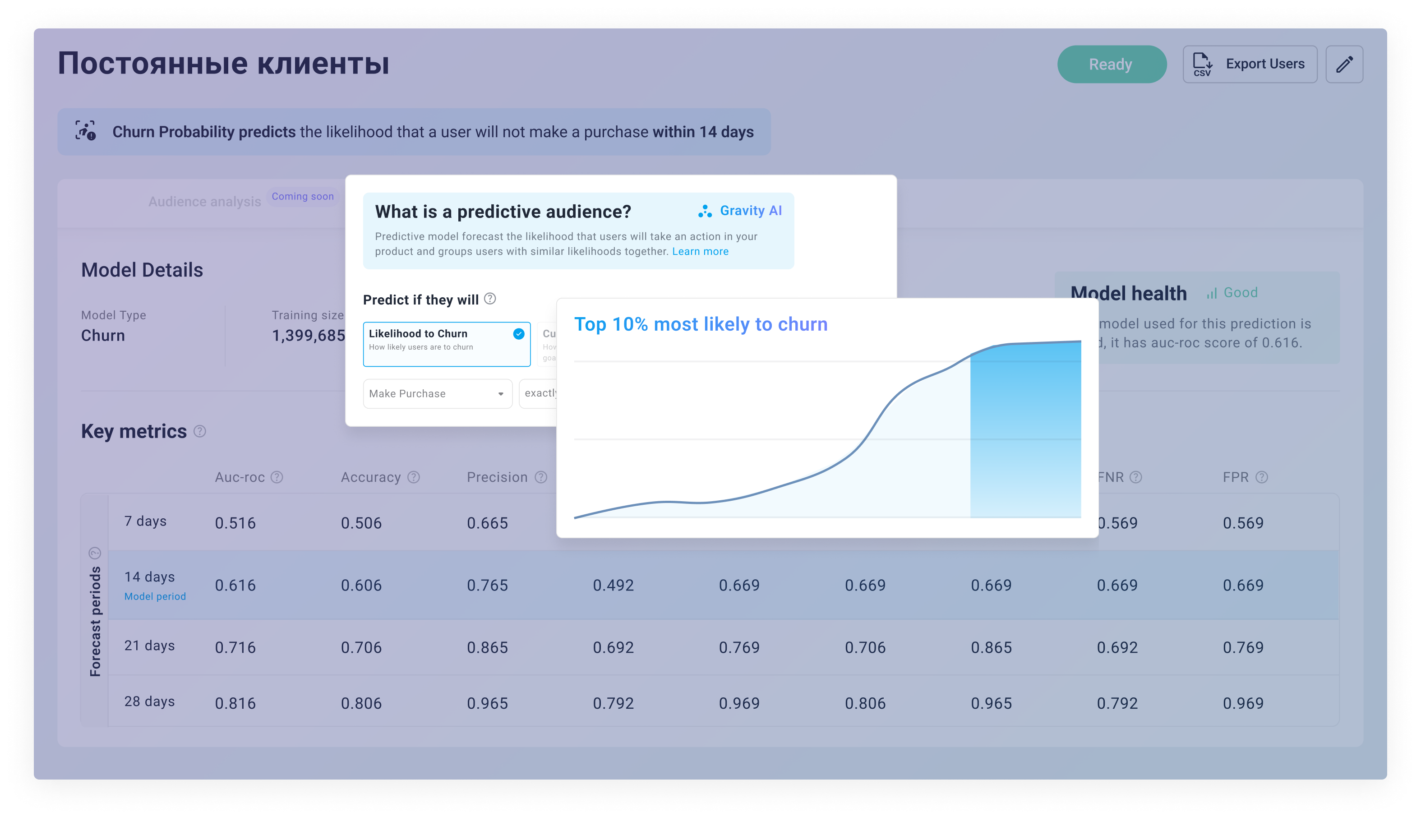 В бесплатном режиме Gravity AI доступно только предсказание оттока. В полной версии вы получите все характеристики модели, описывающие качество и надежность предсказаний Gravity AI, а в дальнейшем и дополнительные предиктивные модели (Вероятность покупки, Сумма покупки, Сумма оффера).